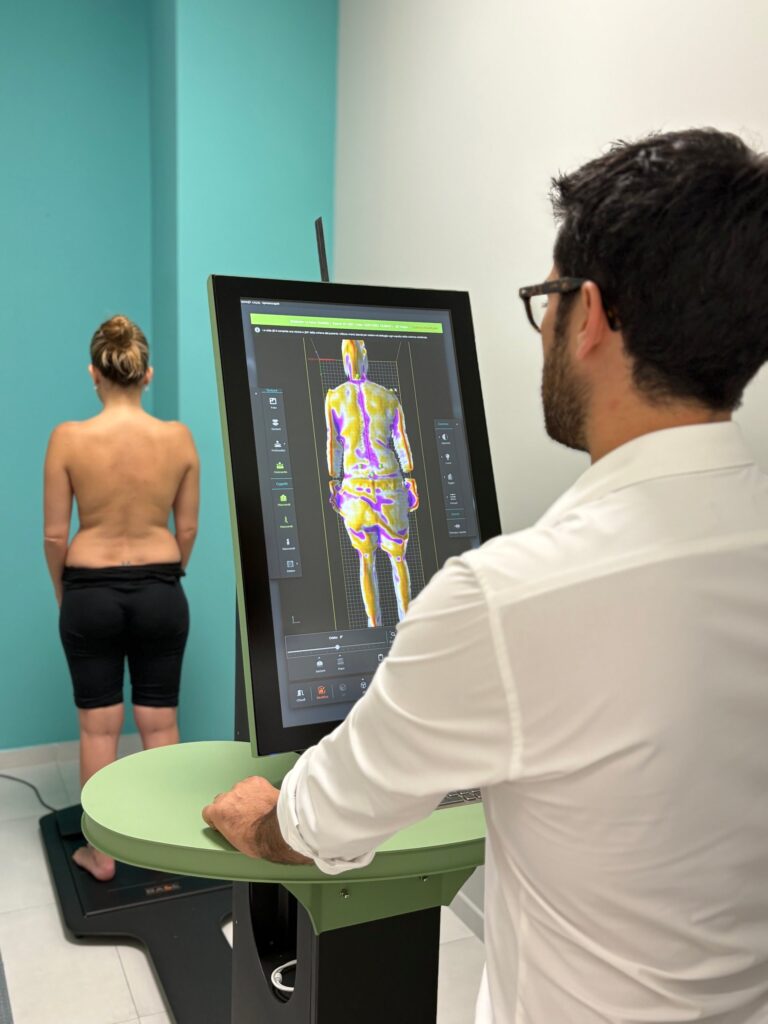 Spine 3D è un sistema che, attraverso un sensore ottico di ultima generazione, cattura in pochi secondi una mappa completa della colonna vertebrale e della postura, senza toccare il paziente e senza usare raggi X. Il paziente si posiziona in piedi, in modo naturale, e il macchinario registra la forma e l’allineamento della colonna vertebrale, visualizzandola in 3 dimensioni con estrema accuratezza. Questo tipo di rilevamento è chiamato analisi optoelettronica della superficie dorsale ed è oggi considerato una delle tecnologie più affidabili per valutare scoliosi, asimmetrie posturali, alterazioni vertebrali e compensi muscolari.